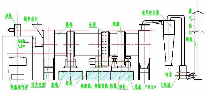 干燥的濕物料由皮帶輸送機(jī)或斗式提升機(jī)送到料斗,然后經(jīng)料斗的加料機(jī)通過(guò)加料管道進(jìn)入加料端。加料管道的斜度要大于物料的自然傾角,以便物料順利流入干燥器內(nèi)。干燥器圓筒是一個(gè)與水平線略成傾斜的旋轉(zhuǎn)圓筒。物料從較高一端加入,載熱體由低端進(jìn)入,與物料成逆流接觸,也有載熱體和物料一起并流進(jìn)入筒體的。隨著圓筒的轉(zhuǎn)動(dòng)物料受重力作用運(yùn)行到較底的一端。濕物料在筒體內(nèi)向前移動(dòng)過(guò)程中,直接或間接了載熱體的給熱,使?jié)裎锪系靡愿稍铮缓笤诔隽隙私?jīng)皮帶機(jī)或螺旋輸送機(jī)送出。在筒體內(nèi)壁上裝有抄板,它的作用是把物料抄起來(lái)又撒下,使物料與氣流的接觸表面增大,以提高干燥速率并促進(jìn)物料前進(jìn)。載熱體一般分為熱空氣、煙道氣等。載熱體經(jīng)干燥器以后,一般需要旋風(fēng)除塵器將氣體內(nèi)所帶物料捕集下來(lái)。如需進(jìn)一步減少尾氣含塵量,還應(yīng)經(jīng)過(guò)袋式除塵器或濕法除塵器后再放排放。